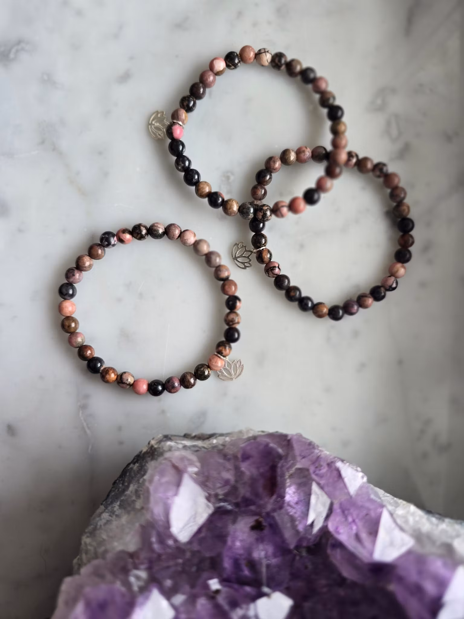 Vackert handgjort armband av Julia med 6mm pärlor i Rodonit samt en berlock i äkta silver (lotusblomma)