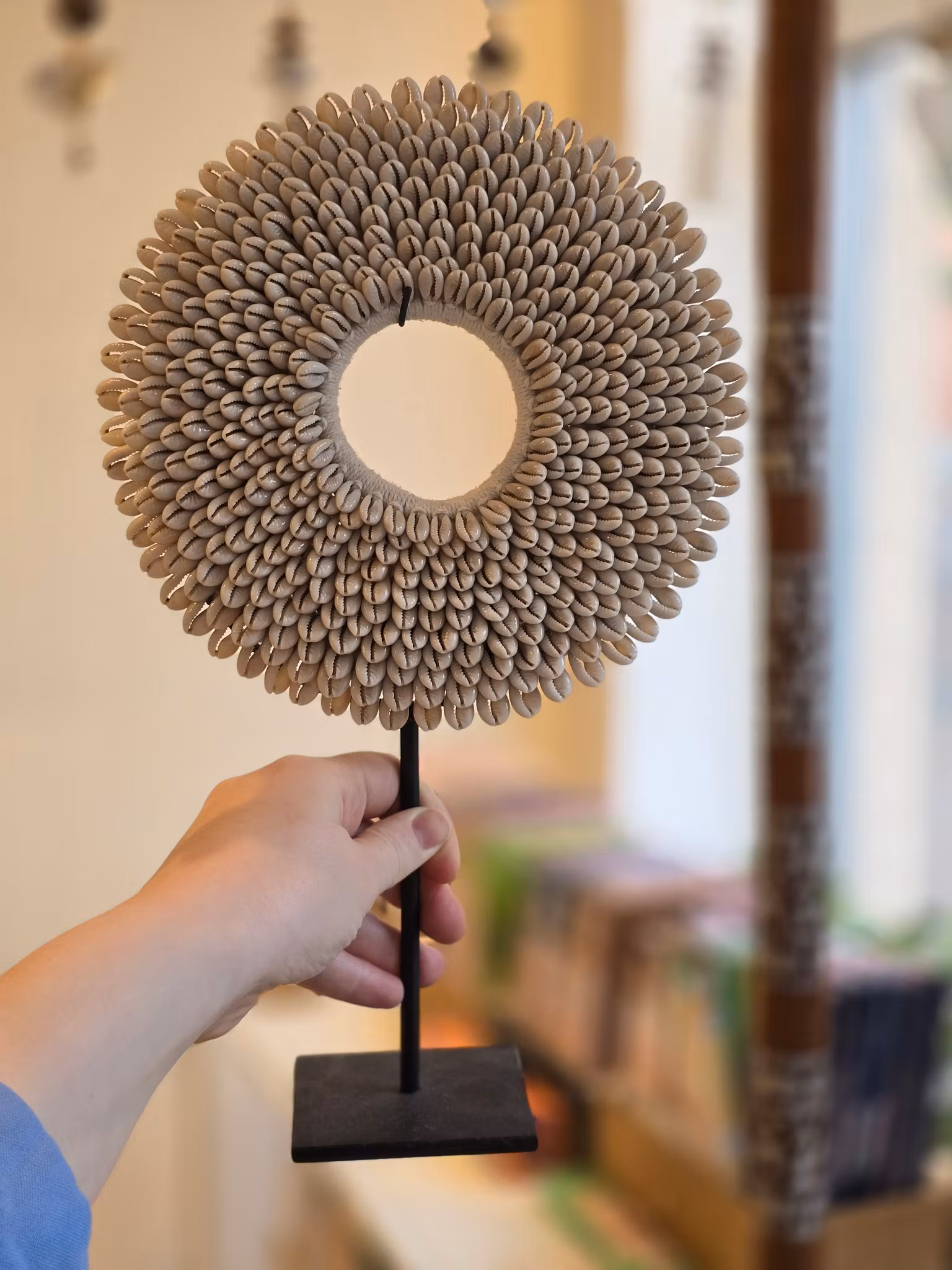 Dekoration med snäckor på ställning (handgjord från Bali) 1 095 kr Tyvärr är denna produkten slutsåld, bevaka gärna så får du ett mail när/om produkten finns i lager igen.