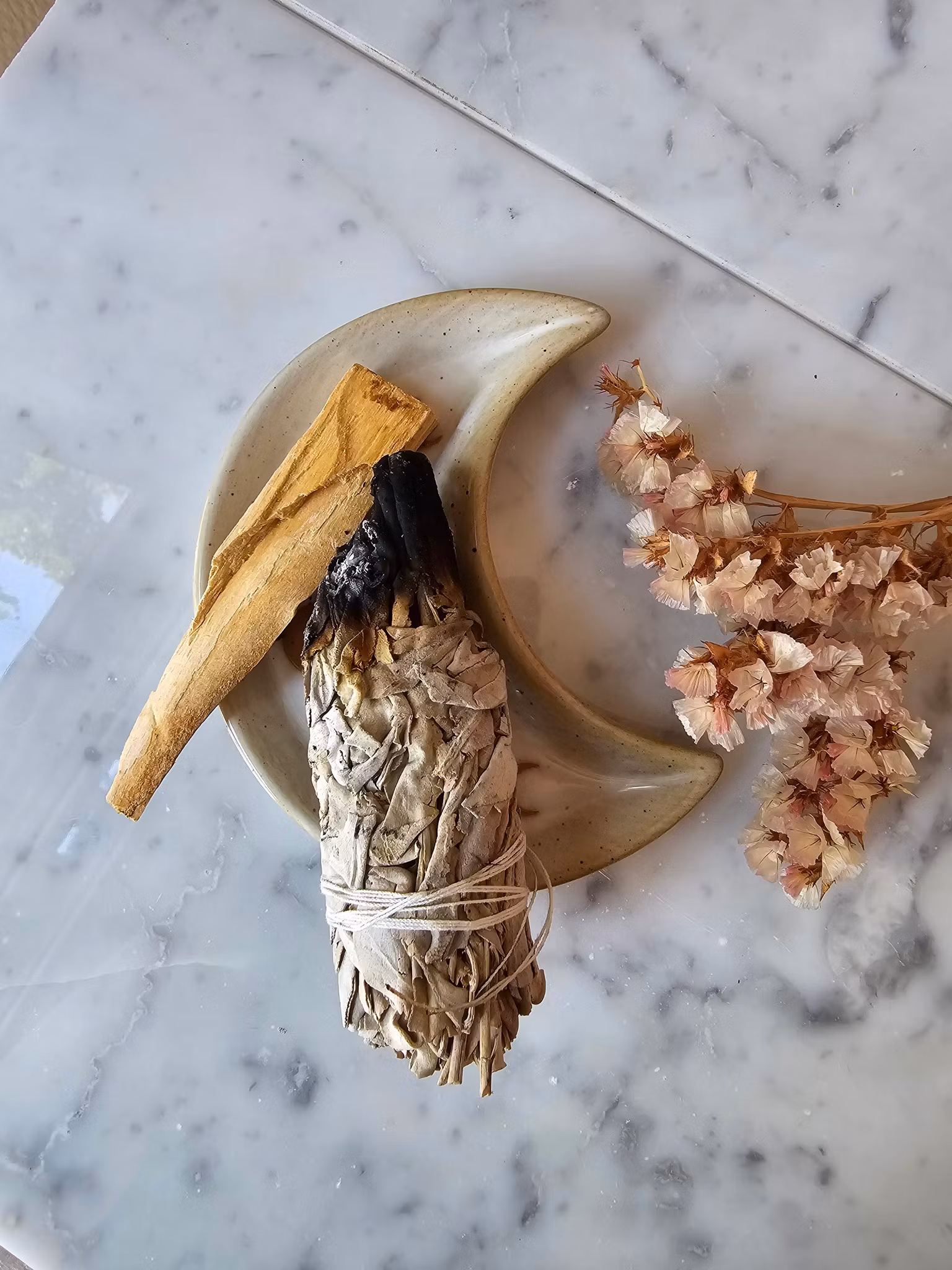 Vackert fat med månfaser på, perfekt för salviabunt/palo santo eller smycken.