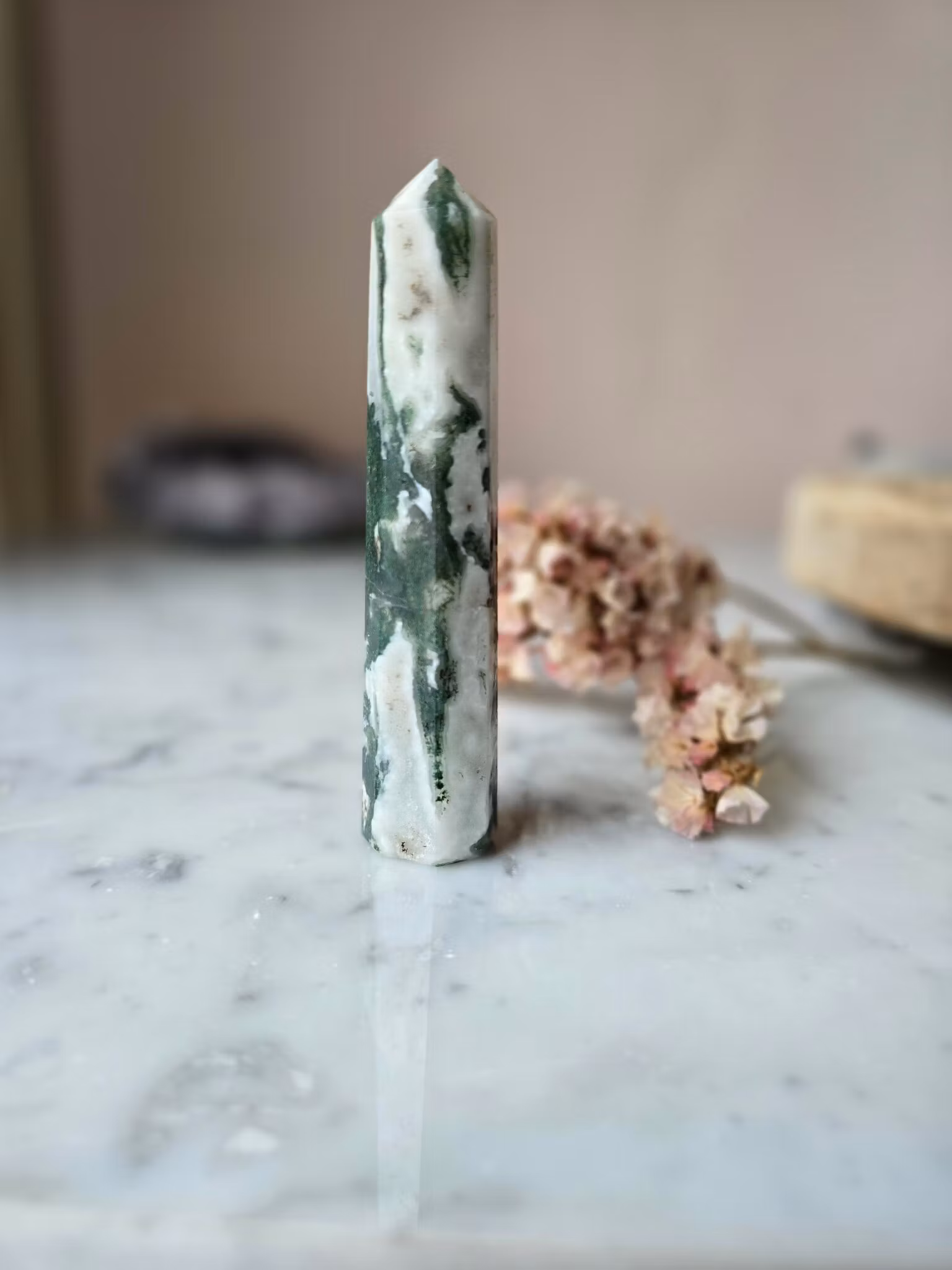 Mossagat lugnar och grundar dig, den sägs synkronisera oss så att vi är ett med naturen. Den för in naturen gröna närande energier till våra liv. Det sägs också vara en fin sten att bära vid en förlossning för trygghet. Den rensar bort eventuella blockeringar, minskar stress och rädslor. Kan även väcka vår andlighet och intuition. Kan även stabilisera våra känslor och ge oss mod att gå vidare.