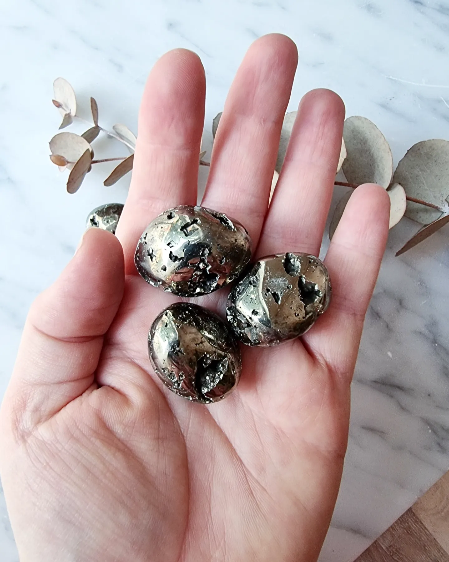 Pyriten sägs stärka vår personliga utveckling, kallas ofta för en ”pengamagnet” då den drar till sig överflöd, lycka & framgång. Den sägs stärka vår kreativitet och stärka vår inspiration. Pyriten jobbar på och stärker vårt solarplexus& navelchakra. Extra bra att använda vid manifestering.