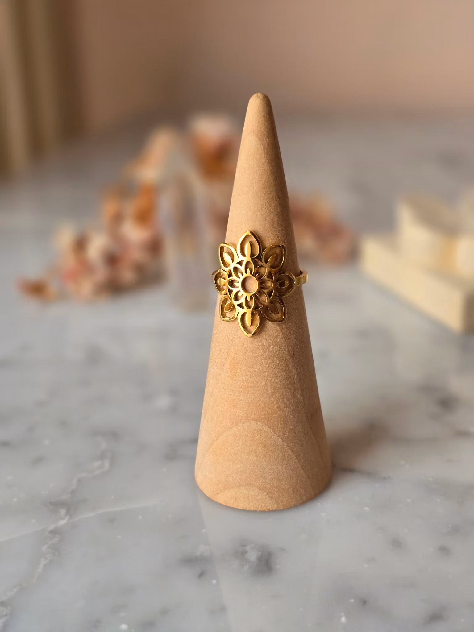 Ring med mandala/blomma 2 , guldpläterat rostfritt stål 49 kr Tyvärr är denna produkten slutsåld, bevaka gärna så får du ett mail när/om produkten finns i lager igen. Produktbeskrivning & mer information Recensioner Justerbar storlek.304 rostfritt stål