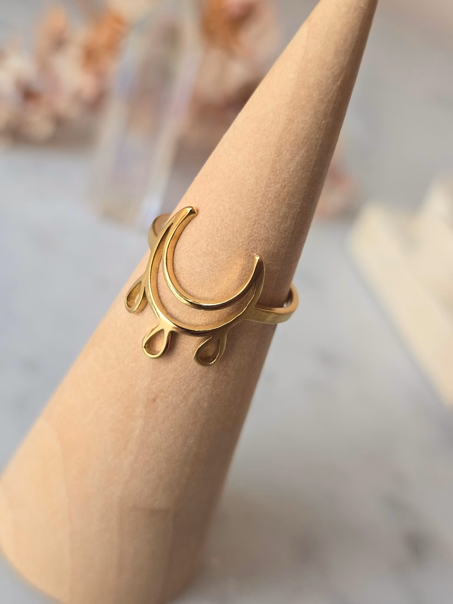 Ring med måne & droppar, guldpläterat rostfritt stål 49 kr Tyvärr är denna produkten slutsåld, bevaka gärna så får du ett mail när/om produkten finns i lager igen. Produktbeskrivning & mer information Recensioner Justerbar storlek.304 rostfritt stål